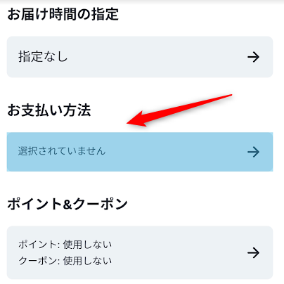 この時点では「お支払い方法」が「選択されていません」となっているので、この項目をタップします。