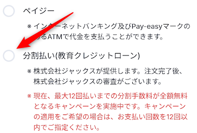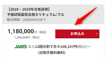 教育クレジットローンが利用できる場合、商品金額の下に「JACCSなら〇回分割で月々〇〇円〜」という目安が記載されています。