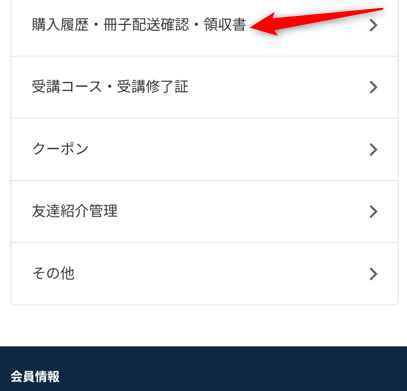 マイページの(☰)メニューの会員情報・設定から、購入履歴・領収書があります。