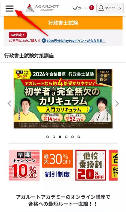 アガルート公式サイトから、以下の手順で申請フォームにアクセスして申し込みます。