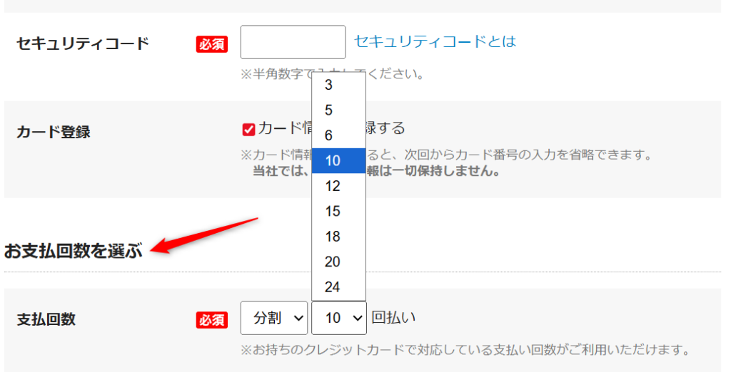 クレジットカード決済を選択した場合、クレジットカード情報の入力画面で「分割払い」を選ぶことができます。