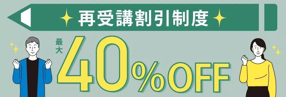 基本的には、再受講割引と他のキャンペーン(早期割引や友人紹介割引など)の併用とはできませんが、 再受講割引の「40%オフ」は、数ある割引制度の中でもトップクラスの割引率です。